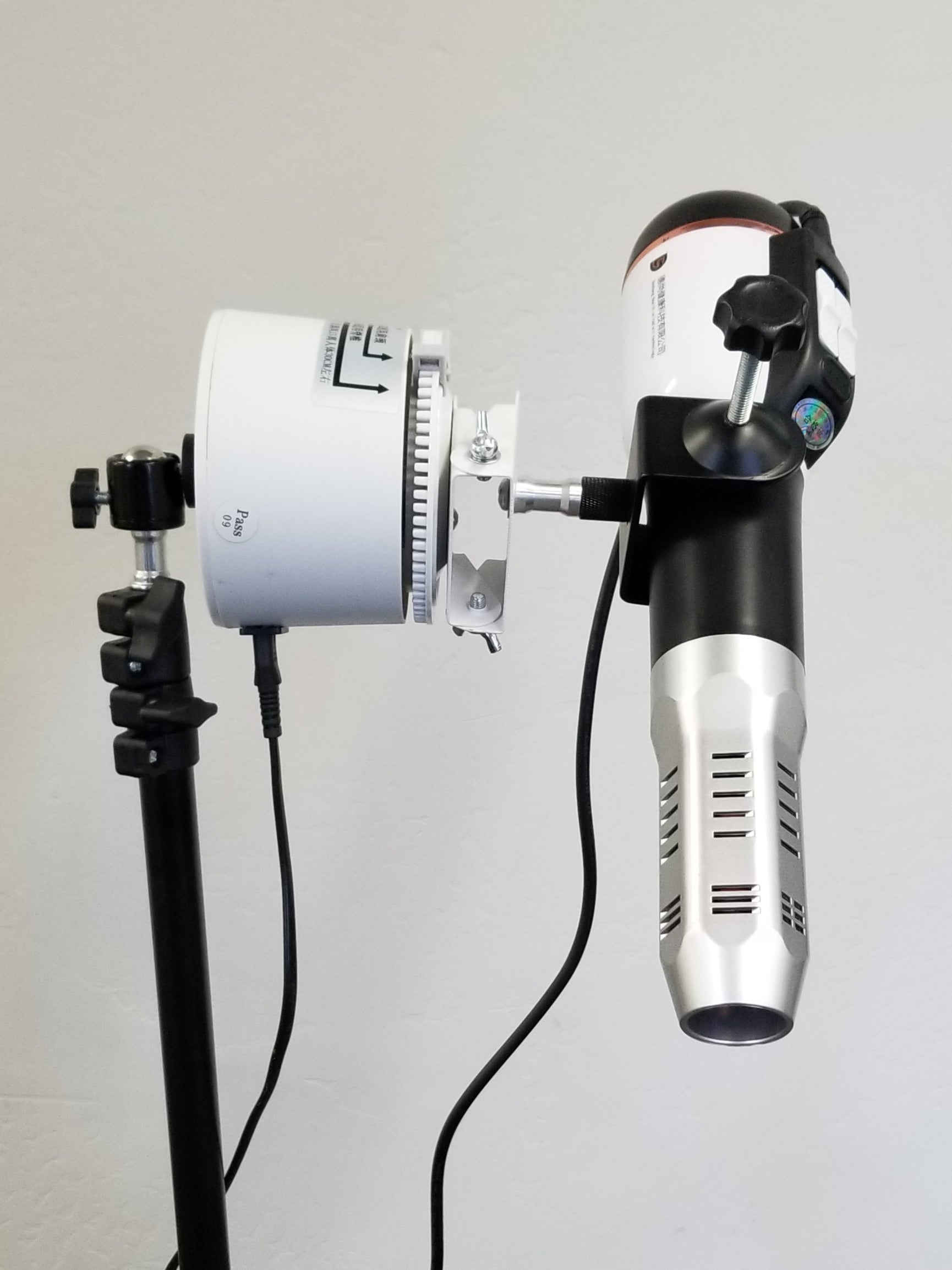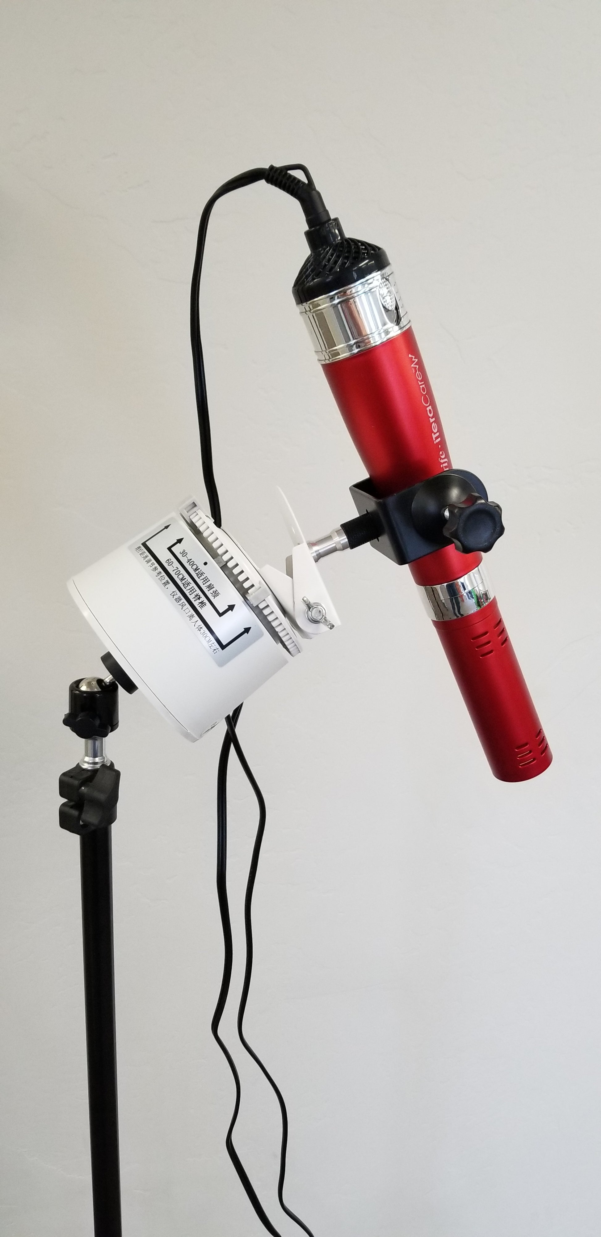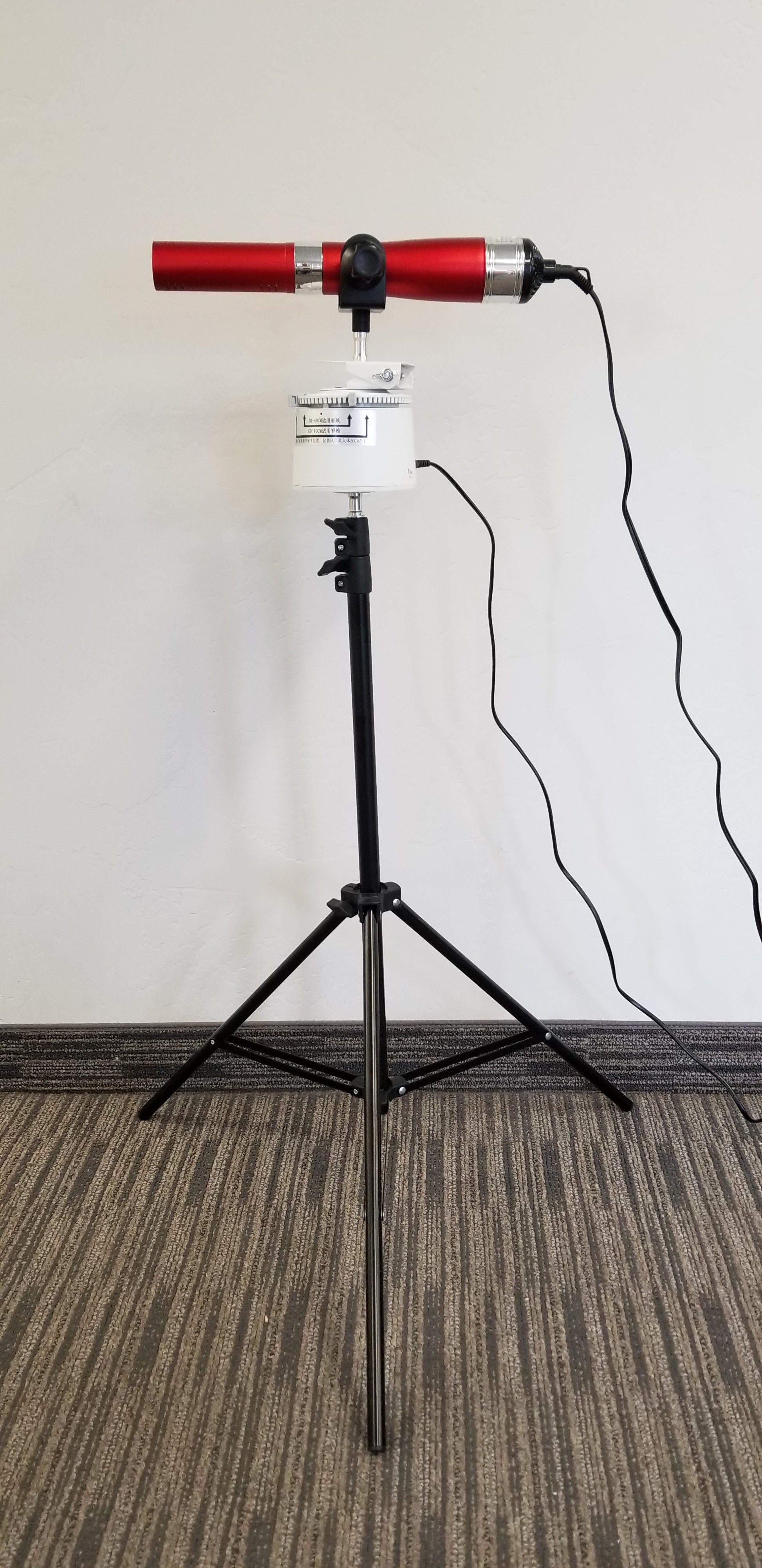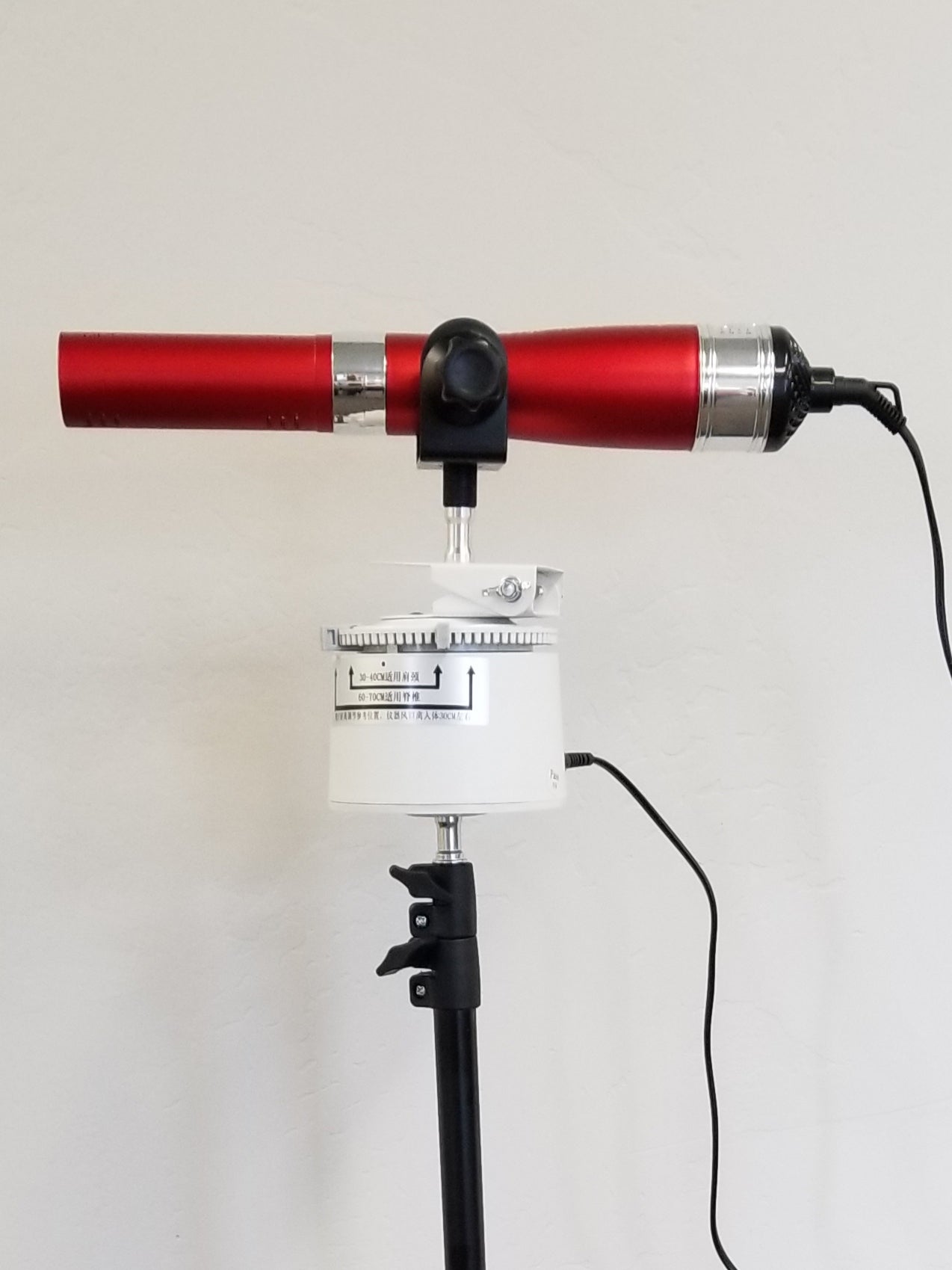 PLEASE NOTE: The white top that rotates the wand operates on 110V. It is also quite heavy, even more so with an attached blower. So when attached to the ball swivel adapter and turned on its side, please position it directly over top of one of the three tripod legs to enhance stability! Also use with great care as it can be tipped over and the blower crystal can be broken.
