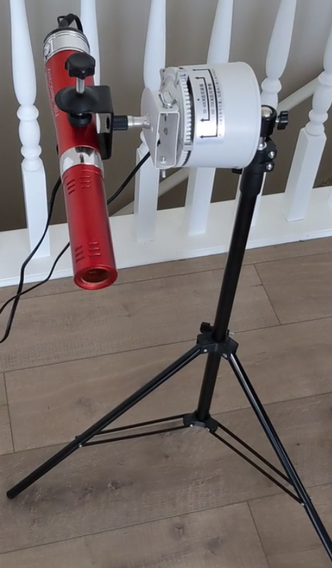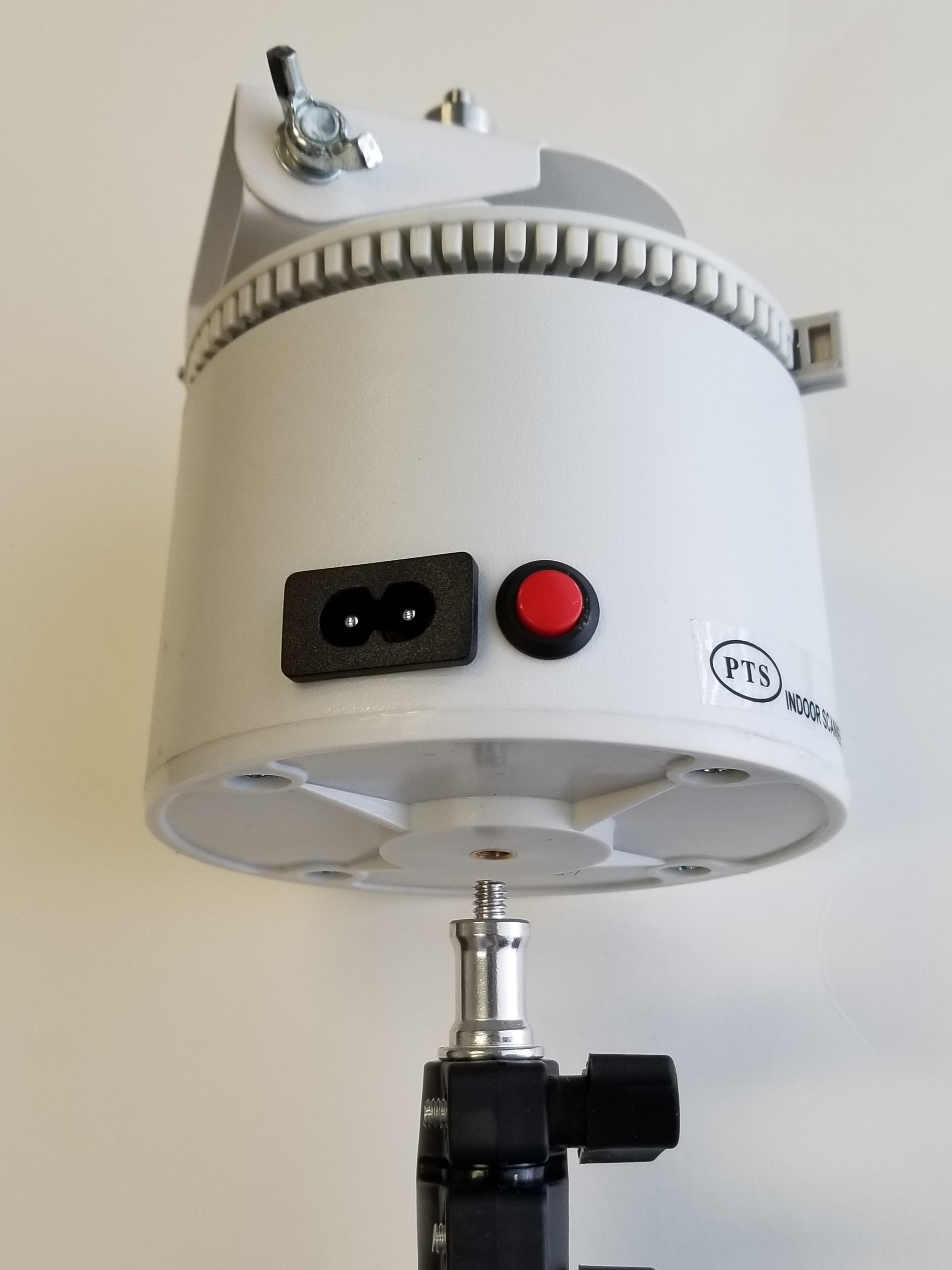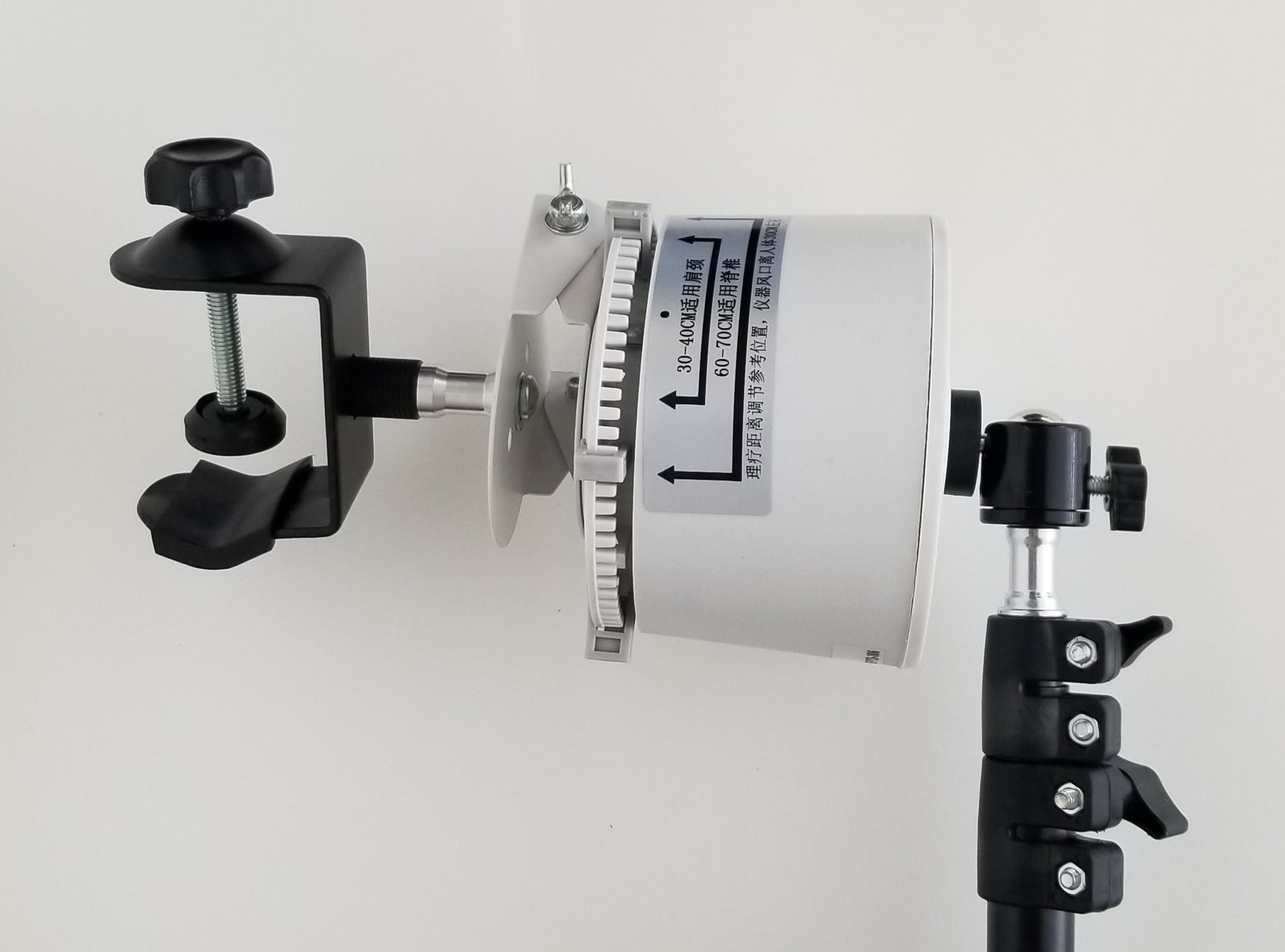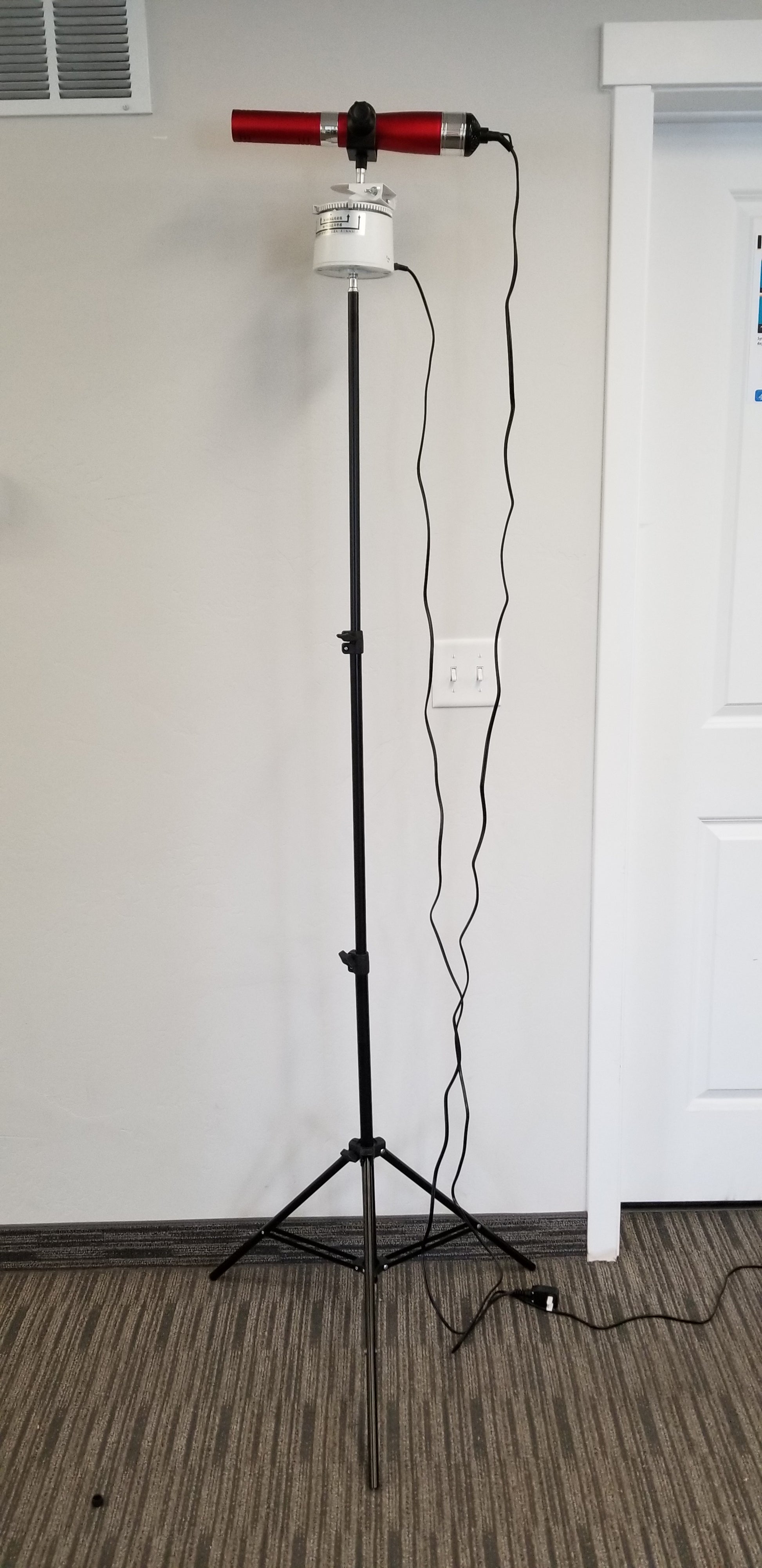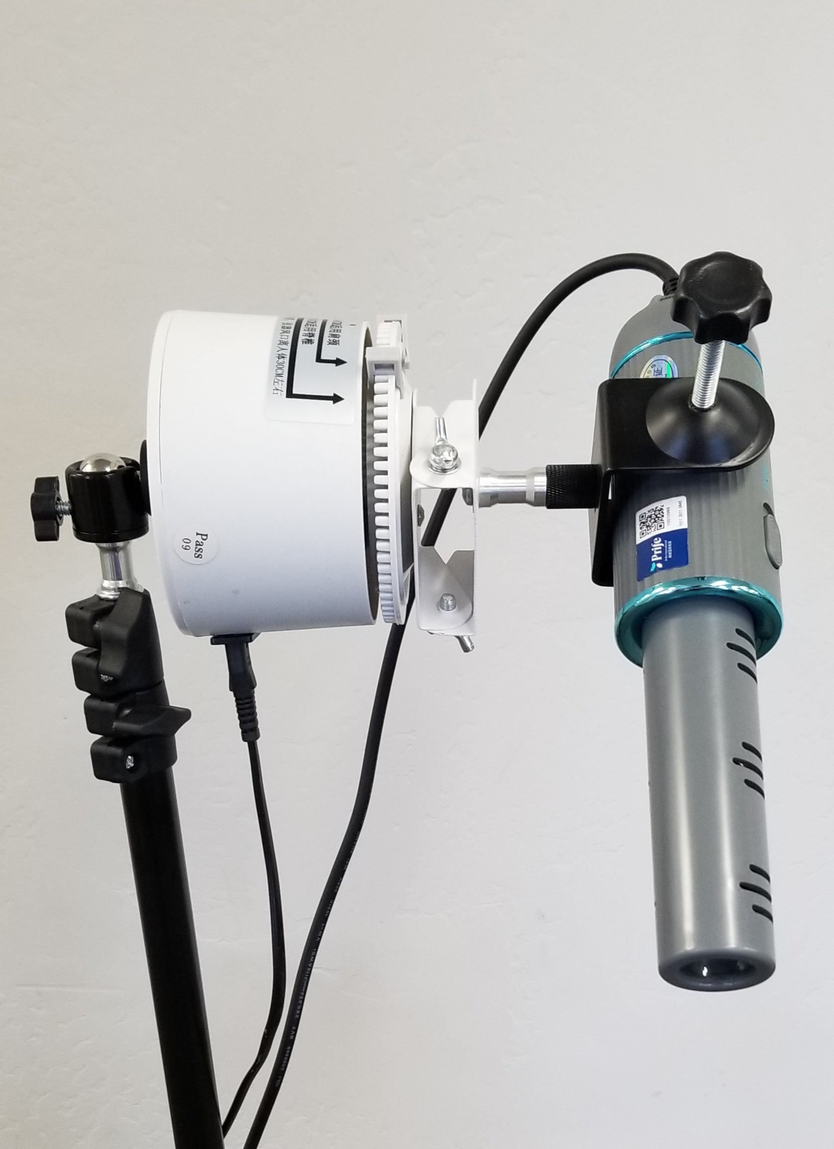 PLEASE NOTE: The white top that rotates the wand operates on 110V. It is also quite heavy, even more so with an attached blower. So when attached to the ball swivel adapter and turned on its side, please position it directly over top of one of the three tripod legs to enhance stability! Also use with great care as it can be tipped over and the blower crystal can be broken.