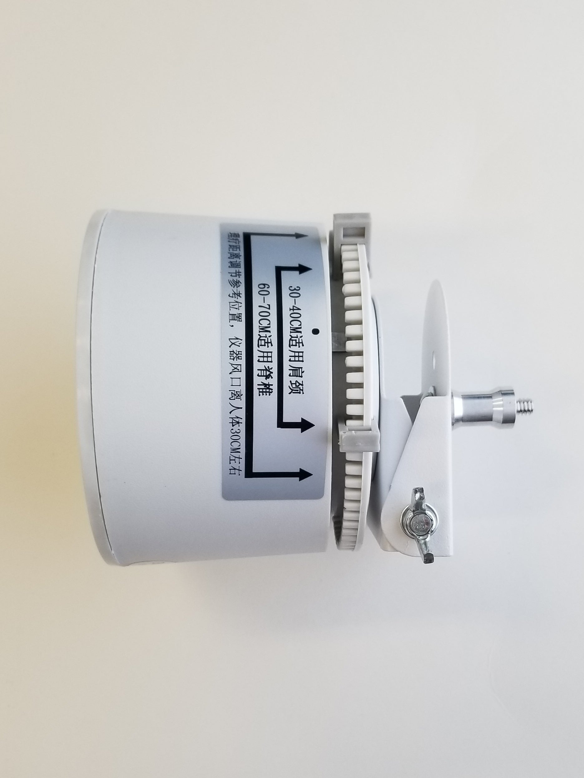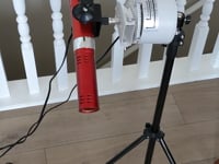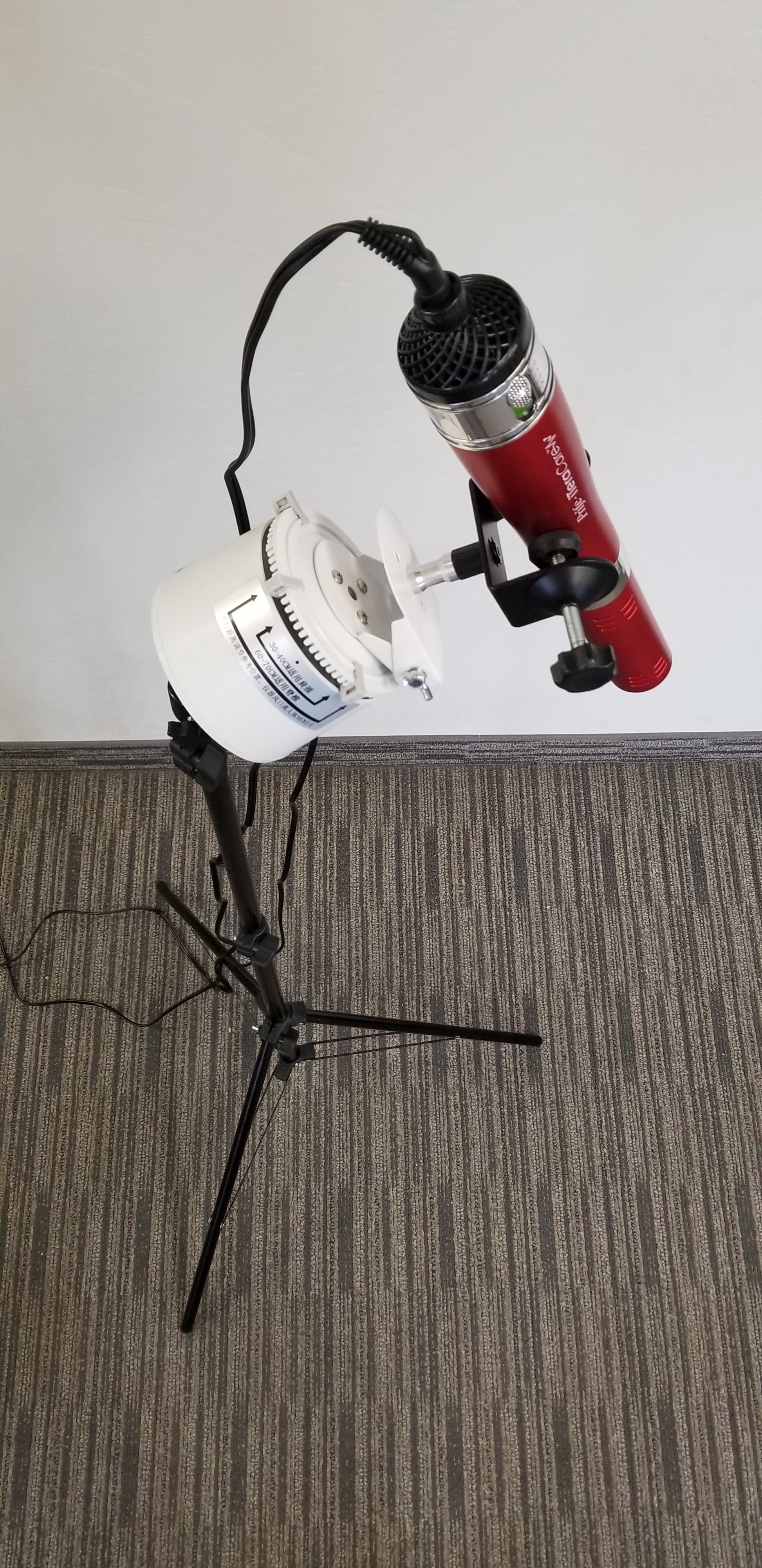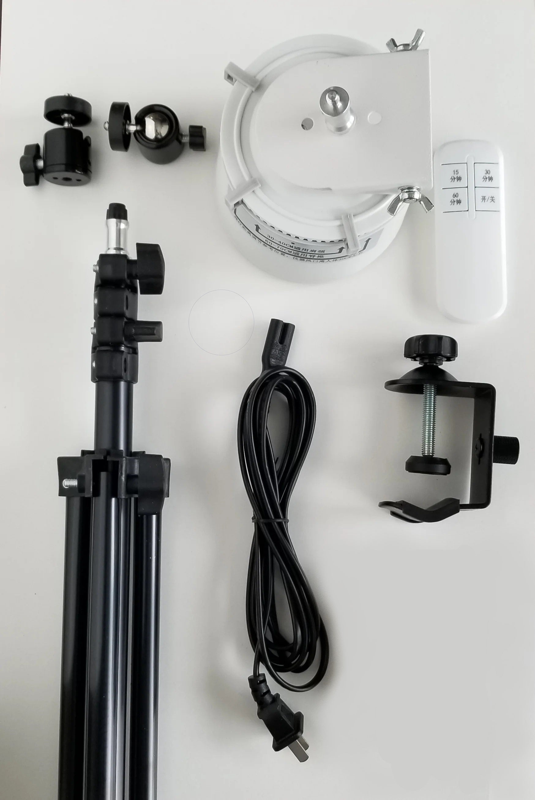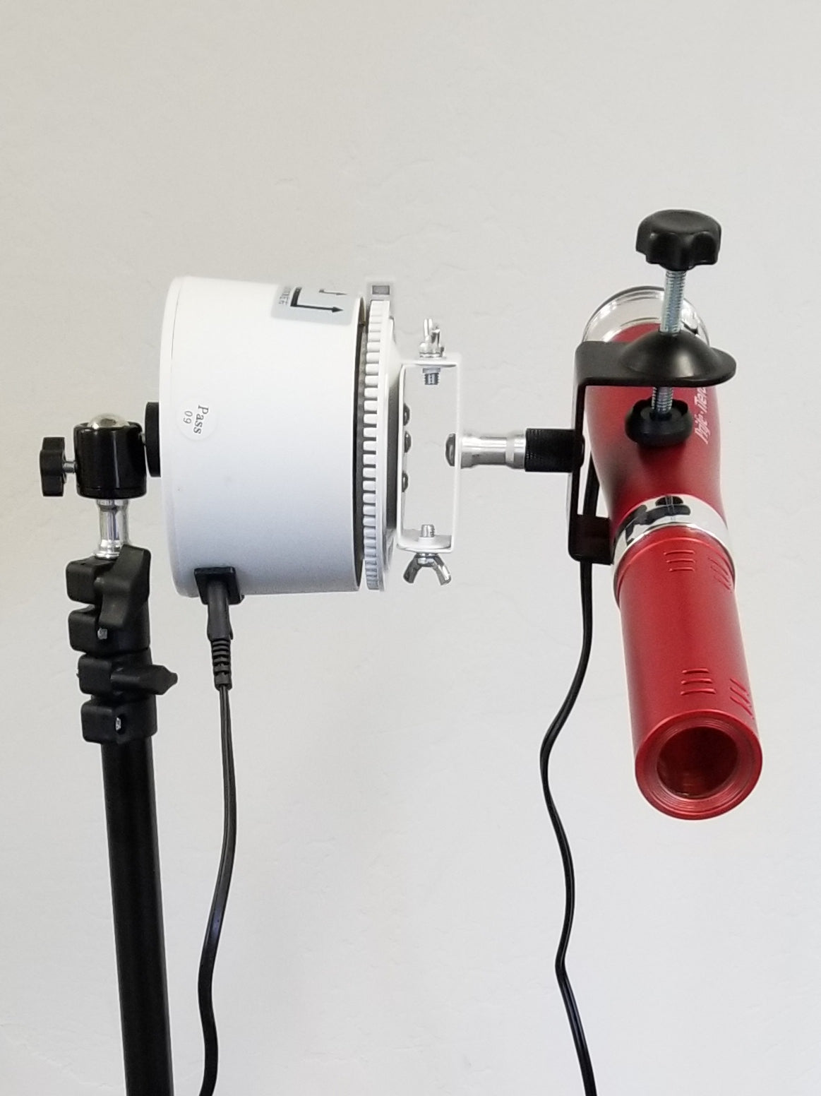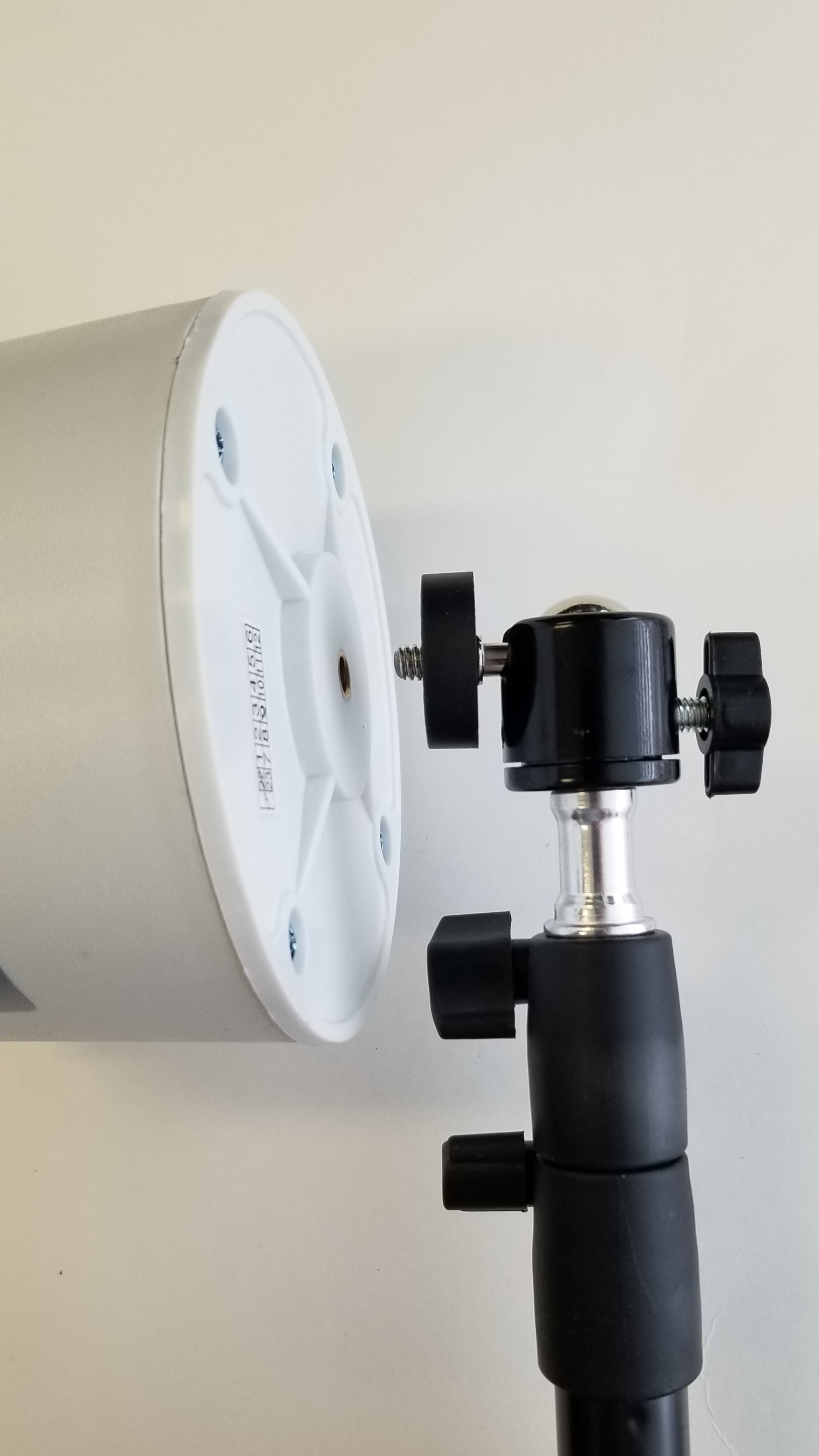 PLEASE NOTE: The white top that rotates the wand operates on 110V. It is also quite heavy, even more so with an attached blower. So when attached to the ball swivel adapter and turned on its side, please position it directly over top of one of the three tripod legs to enhance stability! Also use with great care as it can be tipped over and the blower crystal can be broken.