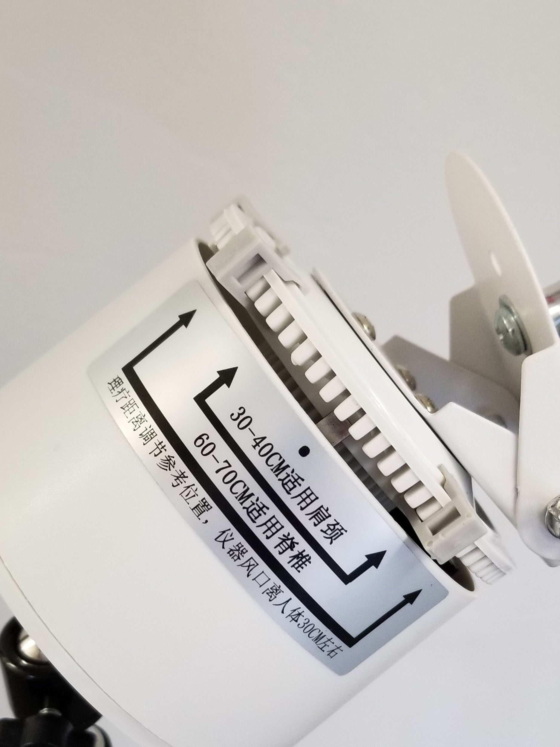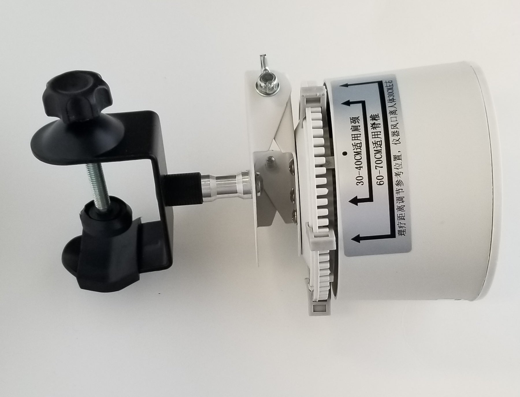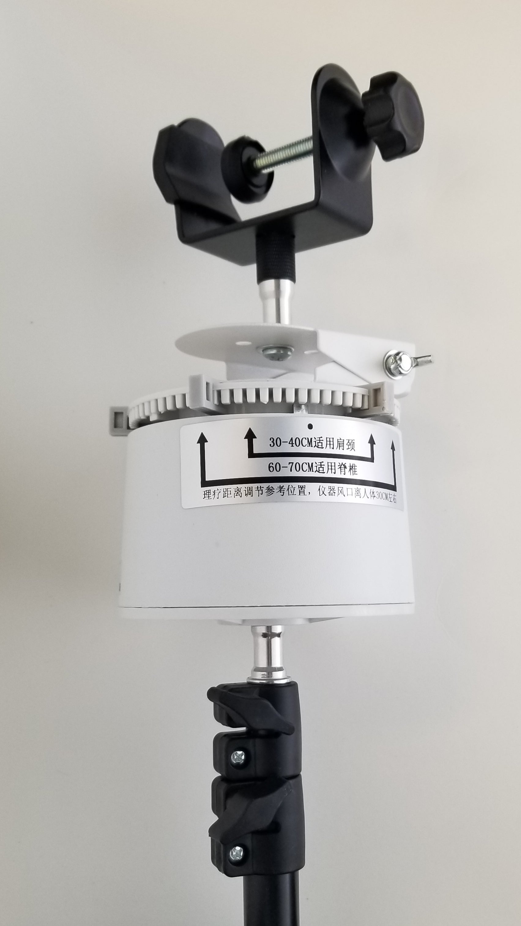 This fully adjustable stand will hold any of the iTeraCare blowers (Classic, Pro, or Premium) and will oscillate (move back and forth, or up and down if tipped on the side) over a range that can be adjusted with moveable tabs (clips). This allows the blower to blow up and down a user's spine, or front, while the user is seated in a chair.