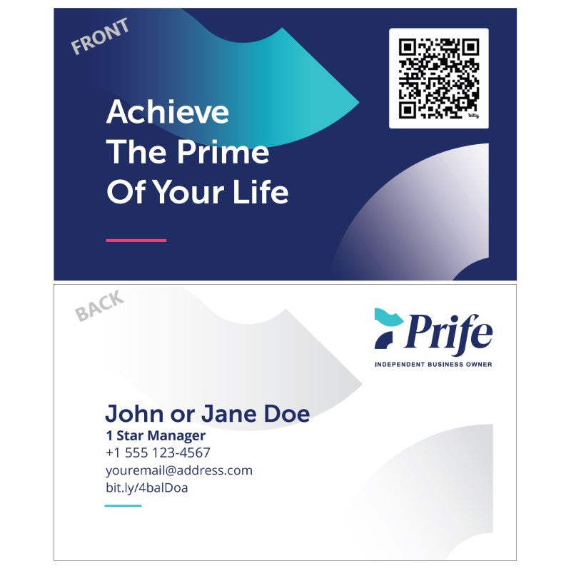 This is a simple Prife business card with a QR Code on the front that can point to our website with your Referral ID, all converted to a condensed bit.ly address, as shown on the back, for simplicity and enhanced readability on mobile devices.